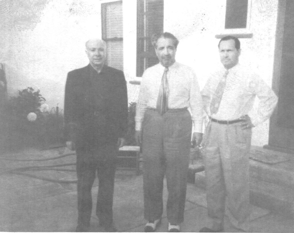 Stephano LaSalle, Jack Dragna, and Tommy Lucchese at Dragna’s home for the wedding of his daughter, 1948.