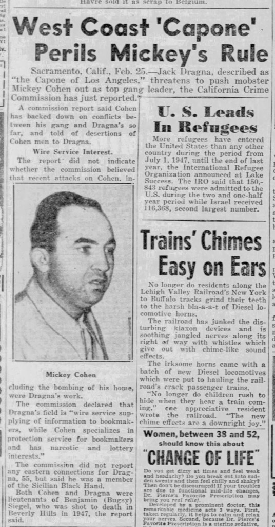 Mickey’s run of the rackets in Los Angeles was about Up anyway. After being convicted of tax evasion in the summer of 1951, he spent four years in prison. whatever bookmaking and union interests he held transferred to the italians. If you could call it a war, then Dragna certainly Won.