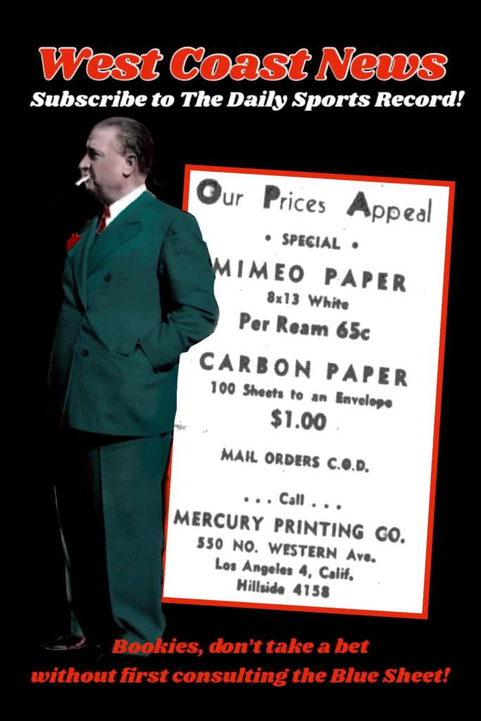 In California, Jack Dragna incorporated West Coast News and Globe Distribution, printing The Daily Sports Record–a scratch (pamphlet) nicknamed the Blue Sheet. In Las Vegas, Ben Siegel and Moe Sedway put together their own complimentary brand of TA, establishing the Golden Nugget News out of Guy McAfee’s new casino.